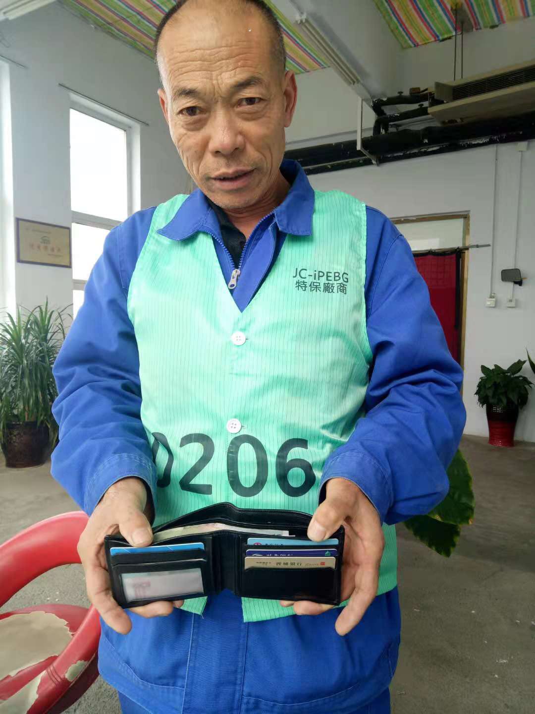 2018年10月16日,我公司員工賈聯(lián)化在富士康清潔時(shí)發(fā)現(xiàn)一個(gè)男士錢(qián)包,里面有加油卡、銀行卡以及一些現(xiàn)金,賈師傅連忙通知了部門(mén)主管,請(qǐng)她幫忙聯(lián)系失主。