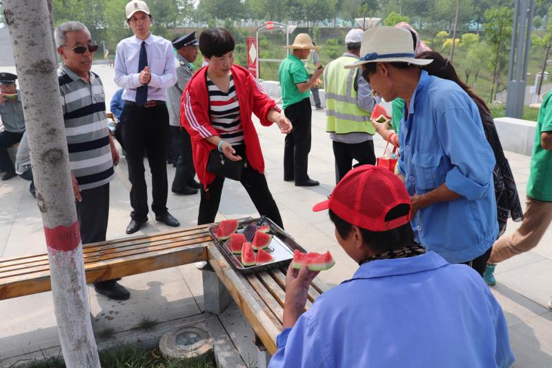 在公園的小廣場,慰問小組工作人員為員工切好西瓜,把西瓜、面包、白糖依次遞到員工手中,員工們親切的笑聲與慰問人員的互動形成了親情、溫情的交織,一片生動和諧的場面。雖然是一個個面包,一塊塊西瓜、一袋袋白糖,卻使員工永遠記住了這美好時光。崔主席也親自為員工切起了西瓜,員工們品嘗著西瓜和面包,感受著領(lǐng)導的關(guān)懷,決心做好自己的本職工作,為晉城創(chuàng)建全國文明城市做出積極貢獻。