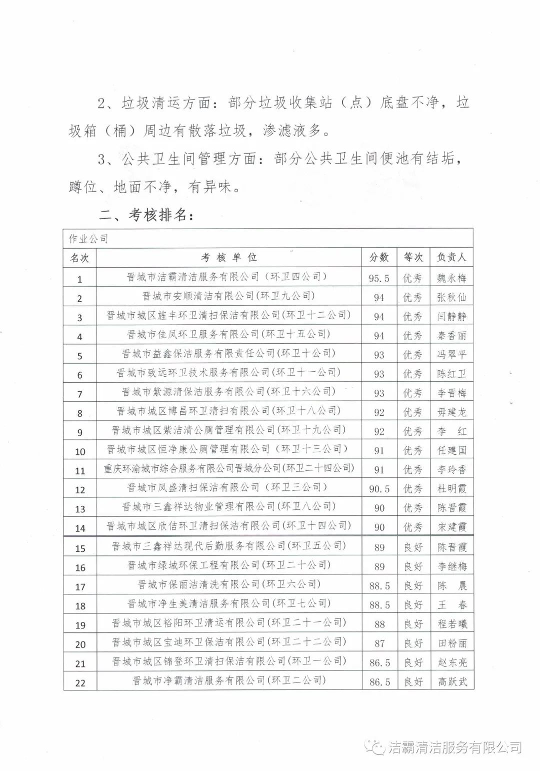 2020年10月28日—10月30日,晉城市城區(qū)市容環(huán)衛(wèi)中心由中心督查室牽頭組織,中心班子成員分別帶隊,機關全體人員參加,對各作業(yè)公司道路清掃路段、垃圾收集站(點)和公廁采用交叉檢查和隨機抽查的方式對24個作業(yè)公司的環(huán)境衛(wèi)生作業(yè)質(zhì)量和4個監(jiān)理公司的日常檢查情況進行了考核。晉城市潔霸清潔服務股份有限公司所屬的環(huán)衛(wèi)四公司分數(shù)最高,名列第一。
