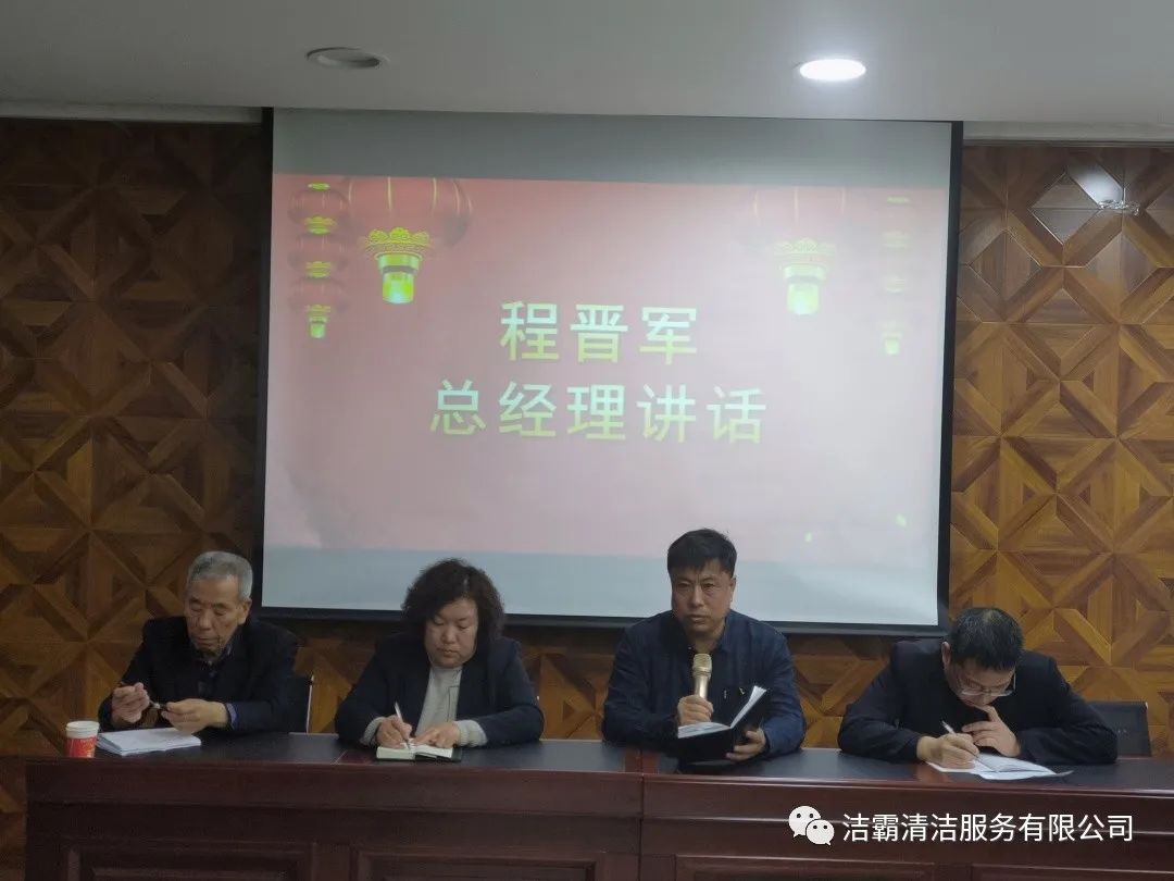 最后,公司總經(jīng)理程晉軍作了重要講話,對新的一年里組織架構(gòu)、產(chǎn)教融合、建立洗衣廠、創(chuàng)建勞務(wù)品牌、建立大運營中心、工程部市場化運作、技能培訓(xùn)、提高用工人數(shù)、承包養(yǎng)老院、建立客戶管理系統(tǒng)等十項工作作了安排部署并提出了新的希望。