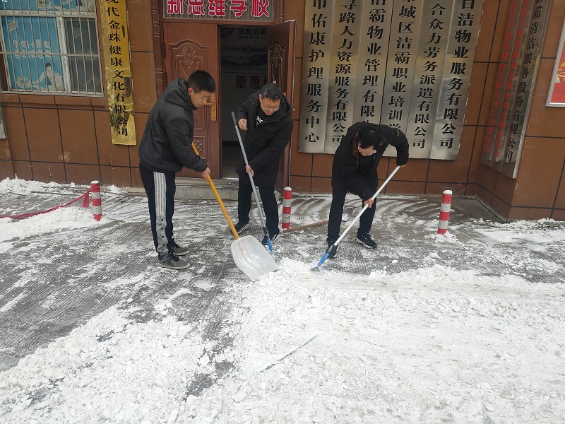 為了景西花園出行居民和公司員工的人身安全,5日早上,公司晨會結束后,由公司辦公室牽頭,潔霸員工們帶著鐵鍬、掃帚、撬棍等工具,在小區(qū)門口開展清除冰雪活動。