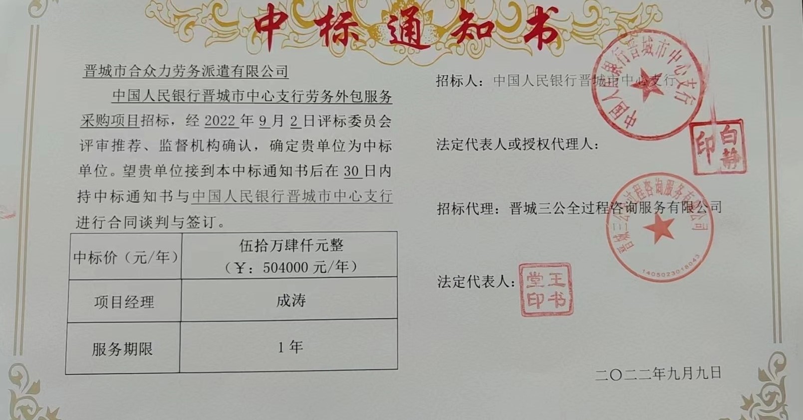 近日,晉城市合眾力勞務派遣有限公司收到《中標通知書》,確定公司為中國人民銀行晉城市中心支行勞務外包服務采購項目的中標人,中標金額504000元。