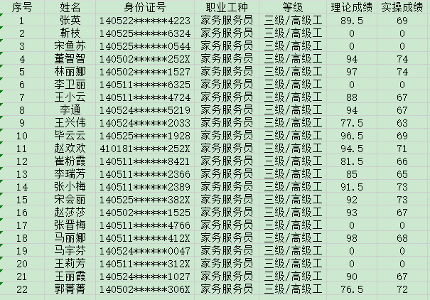 2024年4月28日第1批家政服務(wù)員高級認定人員成績公示