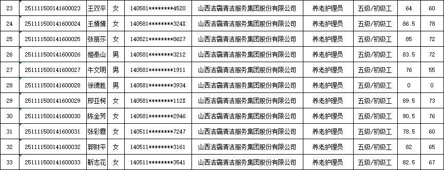山西潔霸清潔服務集團股份有限公司職業(yè)技能等級認定中心現將2025年11月15日認定人員成績公示如下: